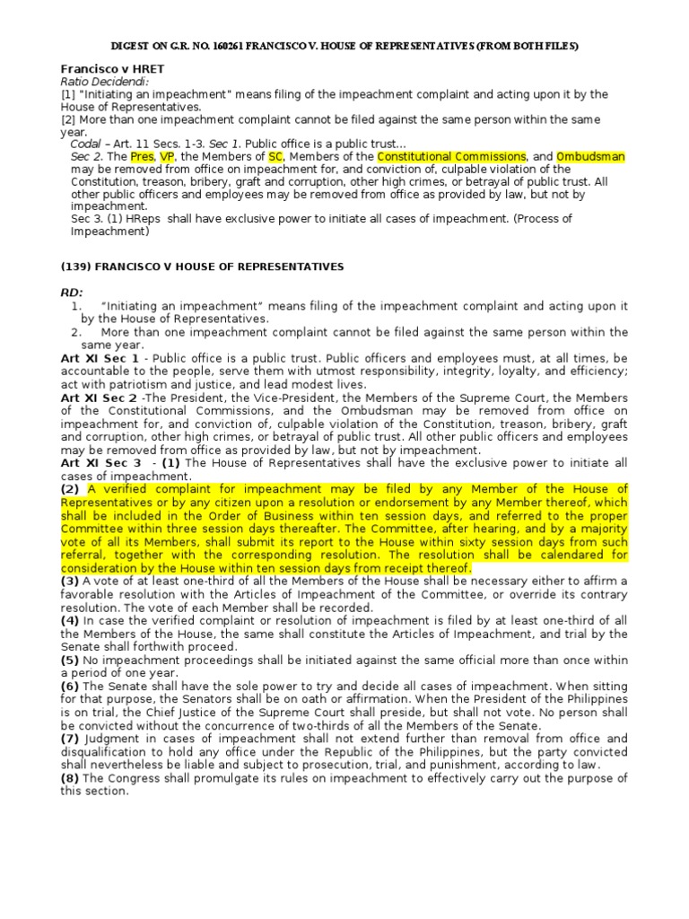 View Francisco Vs House Of Representatives Pictures The complaint was endorsed by house representatives, and was referred to the house committee on justice on 5 august 2003 in accordance with section 3(2) of article xi of the constitution. The number of districts in each state is determined by a state's population. The chair will receive a message. The house and senate have evolved into very different bodies. On 22 july 2002, the house of representatives adopted a resolution, which directed the committee on justice to conduct an investigation, in aid of legislation, on the manner of disbursements and expenditures by the chief justice of the supreme court of the judiciary development fund (jdf). 10, 2003), otherwise known as the davide impeachment case, where it was.